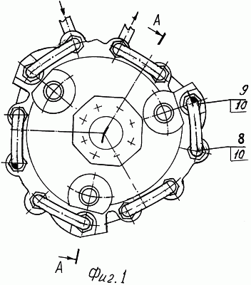 Дополнительно шпильки 8, 9 выполнены полыми и соединены между собой посредством штуцеров 10, образуя каналы циркуляции охлаждающей жидкости (не показано), которые соединены с системой охлаждения, включающей последовательно подключенные циркуляционный насос, воздушный охладитель жидкости, дроссель переменного сечения, каналы теплообменника для прохода жидкости, вентиляторы обдува теплообменника и др.