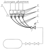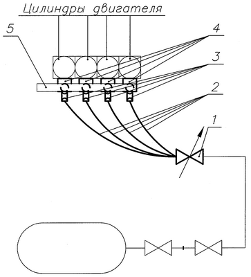 Газ, хранящийся в баллоне, перетекая через разъемное соединение и по трубопроводу высокого давления, поступает в управляемый редуктор 1, где давление понижается до рабочего избыточного и, растекаясь по трубопроводам 2, поступает к электромагнитным управляемым клапанам 3. При неработающем двигателе электромагнитные клапаны 3 выполняют запирающую функцию. При работающем двигателе электромагнитные клапаны 3 выполняют распределительную функцию, позволяющую дозировать порции газа для каждого цилиндра при различных режимах работы двигателя. Порции газа из электромагнитных клапанов попадают в смесители 4 и посредством эффекта эжекции, создаваемого устройством в смесителе, предварительно перемешавшись с воздухом, поступающим из впускного коллектора 5, придают образовавшейся газо-воздушной смеси дополнительный импульс во время цикла всасывания у цилиндра и дозаправляют камеру сгорания.