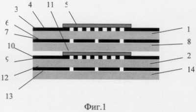 В качестве диэлектрических подложек 1 и 2 используется слюда. На стороны 3, 9 соответственно подложек 1, 2 магнетронным напылением через маску наносятся встречно штыревые Pt контакты 4, 10, на них реактивным магнетронным напылением через маску наносится газочувствительный слой (пленка) SnO2 5, 11. Толщина пленки порядка 100 нм.