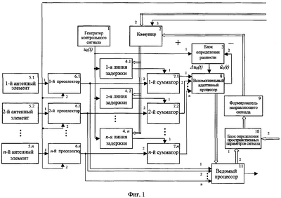 Формирователь направляющего сигнала 9 (представляющий собой кодопреобразователь) ставит в соответствие величинам азимута и угла места величины задержек контрольного сигнала в каждом элементе 12 каждой ЛЗ 4 таким образом, чтобы совокупность сигналов на выходе ЛЗ 4 соответствовала плоской волне, приходящей с направления обнаруженного сигнала. Таким образом, направляющий сигнал представляет собой совокупность управляющих напряжений в виде цифровых кодов для всех элементов 12 всех линий задержки 4. Вспомогательный адаптивный процессор 8 формирует новые весовые коэффициенты, которые подаются на ведомый процессор 11. Коэффициенты передачи в каналах ведомого процессора 11 устанавливаются таким образом, чтобы результат взвешенного сложения был максимальным для сигналов, приходящих с направления обнаруженного ИРИ, а напряжения сигналов с других направлений взаимокомпенсировались при сложении.