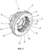 Зажимное кольцо 5 на своей обращенной к основанию 13 патрона 3 нижней стороне снабжено приемным скосом 23, так что оно может быть легко установлено на не представленной здесь винтовой крышке емкости, и крышка может зажиматься кольцом, т.е. обжиматься, и соответствующим образом накручиваться на емкость. Приемный скос 23 имеется на всех сегментах 17 зажимного кольца 5. Выше приемного скоса 23 внутренняя поверхность зажимного кольца 5 и соответственно сегментов 17 выполнена, по существу, цилиндрической и снабжена в данном случае, например, бороздками 27, проходящими параллельно центральной оси 21, так что на внутренней поверхности 25 сегментов 17 и соответственно зажимного кольца 5 образуется подобие зубьев, что является частью устройства для повышения удерживающего усилия кольца 5. Вместо зубьев могут быть предусмотрены, например, накладки из синтетического материала или резины на внутреннюю поверхность 25, чтобы повысить удерживающие усилия и силы трения.