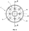 На виде сверху показано основание 13 патрона 3, кроме того, четыре отверстия 95 под винты 81, а также четыре паза 93 зацепления, которые служат для резьбового соединения патрона 3 с накидной гайкой 89.