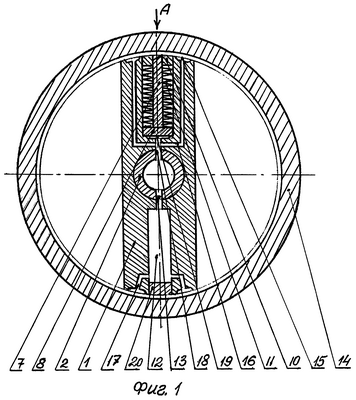 Для освобождения расширителя вторым путем к месту начала протаскивания трубы 14 подгоняется навигатор. Буровая штанга 2 с корпусом резцедержателя 1, закрепленным в ее передней части с помощью болта 3, упорной шайбы 4, шайбы-ограничителя 5 и шайбы-гровера 6, проталкивается в заклиненную, подмятую трубу 14 по возможности ближе к расширителю. Далее с помощью навигатора передается вращательное движение буровой штанге 2 с корпусом резцедержателя 1. Сразу после этого по буровой штанге 2 подается при переменно увеличивающемся давлении гидрожидкость, которая по каналам 13 и 18 обеспечивает смазку контактных поверхностей (внутренней поверхности трубы 14 с устройством 1) и необходимый вылет резца 7 из резцедержателя 9 путем регулирования величины давления на нижнюю поверхность его подпятника 8 через канал 19. Регулировка величины вылета осуществляется тарировкой удерживающей пружины 11, установленной на корпусе резца 7 между верхней поверхностью подпятника 8 и верхней направляющей втулкой 10 резца 7. Вращательное движение, передающееся устройству через буровую штангу 2 при одновременно увеличивающемся вылете резца, обеспечивает процесс отрезания трубы 14. С помощью каналов 12, 13, 16, 17 и 18 создается давление гидрожидкости в выемках 15, расположенных с противоположных торцевых сторон призматического резцедержателя с целью обеспечения смазки и центрирования его в трубе. Балансировочное отверстие 12 со стороны внешней окружности закрыто пробкой 20.