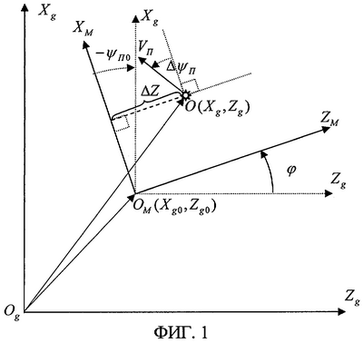 Местную систему координат формируют в момент прохождения команды на стабилизацию заданной линии пути с командного устройства 1, в качестве которого может использоваться, например, приемник командной радиолинии на борту ДПЛА. С этой целью в момент появления команды на стабилизацию заданной линии пути посредством блока памяти 2 запоминают координаты местоположения ДПЛА Xg0, Zg0 в горизонтальной плоскости и значение заданного путевого угла П0 в момент прохождения команды. Точка, определяемая координатами Xg0, Zg0, является точкой начала координат местной системы координат в географической системе координат.