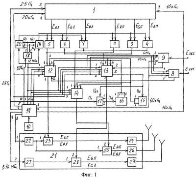Фотоэлектрический преобразователь 1 формирует шесть аналоговых видеосигналов двух изображений, следующих друг за другом. Фотоэлектрический преобразователь 1 и шесть АЦП конструктивно размещены в передающей камере, выходом которой являются шесть двоичных кодов видеосигналов: правого изображения ERП, ЕGП, ЕВП и левого изображения ЕRЛ, ЕGЛ, EВЛ. АЦП преобразуют аналоговые видеосигналы в 8-разрядные коды. Поочередная выдача кодов с АЦП 2, 3, 4 и АЦП 5, 6, 7 выполняется триггером 18 и ключами 19 и 20. Импульсы 50 Гц с десятого выхода синтезатора 11 частот поступают на вход триггера 18, сигнал с первого выхода которого открывает первый ключ 19, пропускающий импульсы 12 МГц в течение 0,02 с /20 мс/ первого кадра на тактовые входы АЦП 2, 3, 4, коды с которых в течение кадра поступают в формирователи 12, 13, 14 кодов. АЦП 5, 6, 7 коды не выдают, на их тактовые входы импульсы 12 МГц не пропускают. С приходом в триггер 18 второго импульса 50 Гц закрывается ключ 19, открывается второй ключ 20, который в течение периода второго кадра 20 мс пропускает импульсы 12 МГц на тактовые входы АЦП 5, 6, 7, коды с которых поступают в формирователи 12, 13, 14. Формирователи кодов преобразуют параллельные коды в последовательные и заменяют в них представление единиц с импульсов на положительные и отрицательные полусинусоиды моночастоты 48 МГц с синтезатора 11 частот. Задающий генератор 10 генерирует синусоидальные колебания со стабильностью 10-7. Синтезатор 11 частот формирует и выдает: с первого выхода импульсы 12 МГц на тактовые входы АЦП 2-7 и на первые управляющие входы формирователей 12, 13, 14 кодов, со второго выхода импульсы 6 МГц на вторые управляющие входы блоков 12, 13, 14 и на первые управляющие входы АЦП 8, 9, с третьего – импульсы 60 кГц на вторые управляющие входы АЦП 8, 9, с четвертого выхода синусоидальные колебания 48 МГц на третьи управляющие входы блоков 12, 13, 14, с пятого выхода импульсы 20 кГц на четвертые управляющие входы блоков 12, 13, на первый вход фотоэлектрического преобразователя 1 и на третьи управляющие входы АЦП 8, 9, с шестого – импульсы 25 Гц на второй вход фотоэлектрического преобразователя 1, на управляющий вход счетчика 17 импульсов /UO/, с седьмого – импульсы 10 кГц на третий вход фотоэлектрического преобразователя 1, с восьмого – синусоидальные колебания 480 МГц первой несущей частоты в усилитель 22, с девятого выхода синусоидальные колебания 576 МГц второй несущей в усилитель 27 второй несущей, с десятого выхода импульсы 50 Гц в триггер 18. АЦП 8, 9 преобразуют сигналы звука в 16-разрядные коды, которые поступают на вторые информационные входы формирователей 12 и 13 кодов. Самоходный распределитель 15 импульсов с приходом UП сигнала пуска со второго выхода блока 13 выдает код из восьми единиц 11111111, являющийся кодом ССИ /599-й отсчет каждой строки/ на третьи информационные входы блоков 12, 13 и на второй информационный вход блока 14. Самоходный распределитель 16 импульсов с приходом сигнала UП пуска со второго выхода счетчика 17 импульсов выдает код из восьми единиц, являющийся синхроимпульсом стереопары СИС /600-й отсчет последней строки каждого четного кадра/ на четвертые информационные входы блоков 12, 13 и на третий информационный вход блока 14. Счетчик 17 двухразрядный, выдает с выхода второго разряда сигнал UП для блока 16 с приходом в него второго импульса со второго выхода формирователя 13 кодов, после чего обнул
