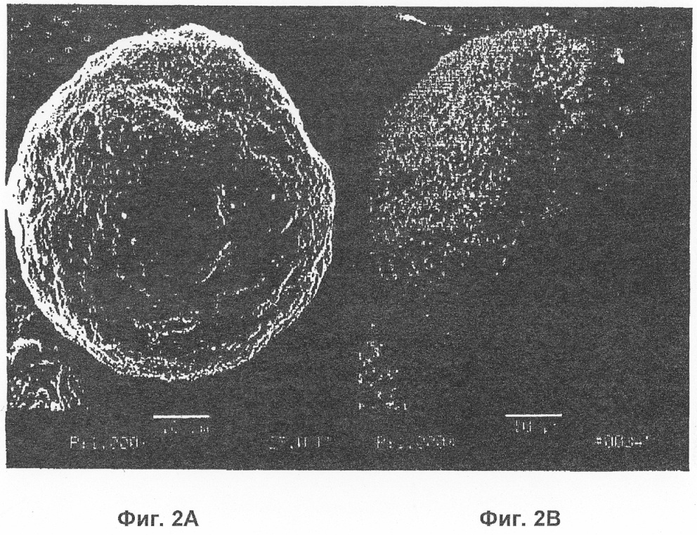 Фиг.2А представляет вторичное электронное изображение сканирующей электронной микрофотографии, при увеличении 1640 Х (измеряемом, когда изображение проецируется в трафарете фотобумаги размером 8,5″×11″), катализатора, приготовленного с использованием способа нитратного импрегнирования, причем катализатор состоит из промотированного платиной кобальта, покрывающего оксид алюминия и приготовленного, как описано в Примере 6.