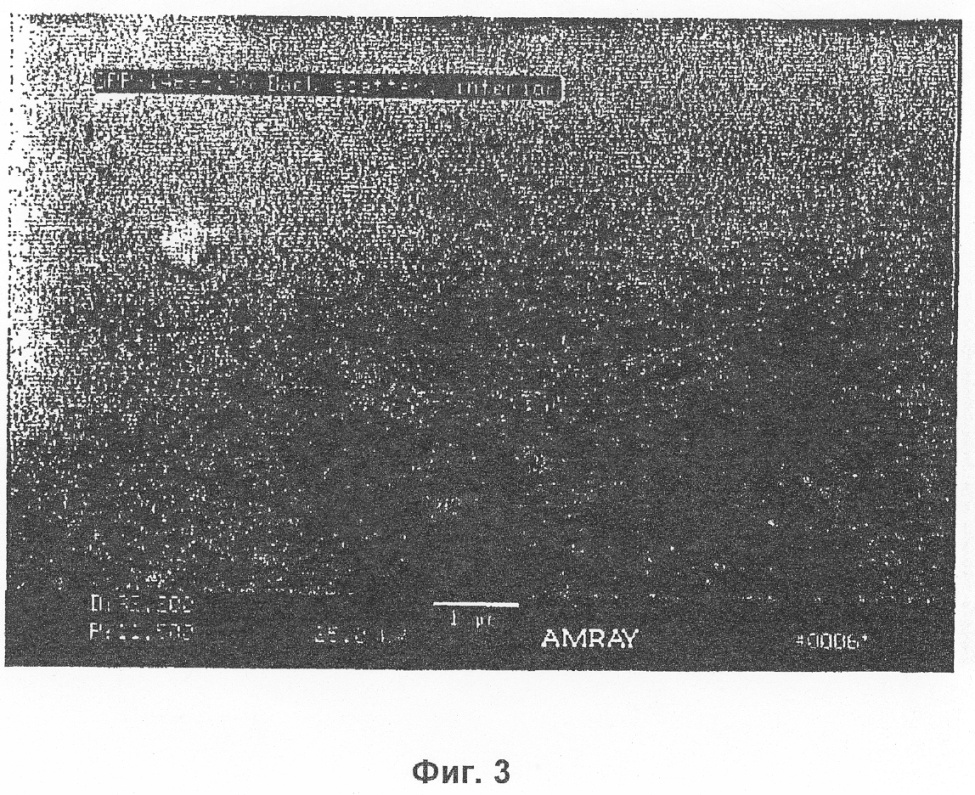 Фиг.3 представляет электронное изображение с обратным рассеянием сканирующей электронной микрофотографии, при увеличении 17000 Х (измеряемом, когда изображение проецируется в трафарете фотобумаги размером 8,5″×11″), внутреннего сечения той же частицы катализатора, которая показана на Фиг.1А.