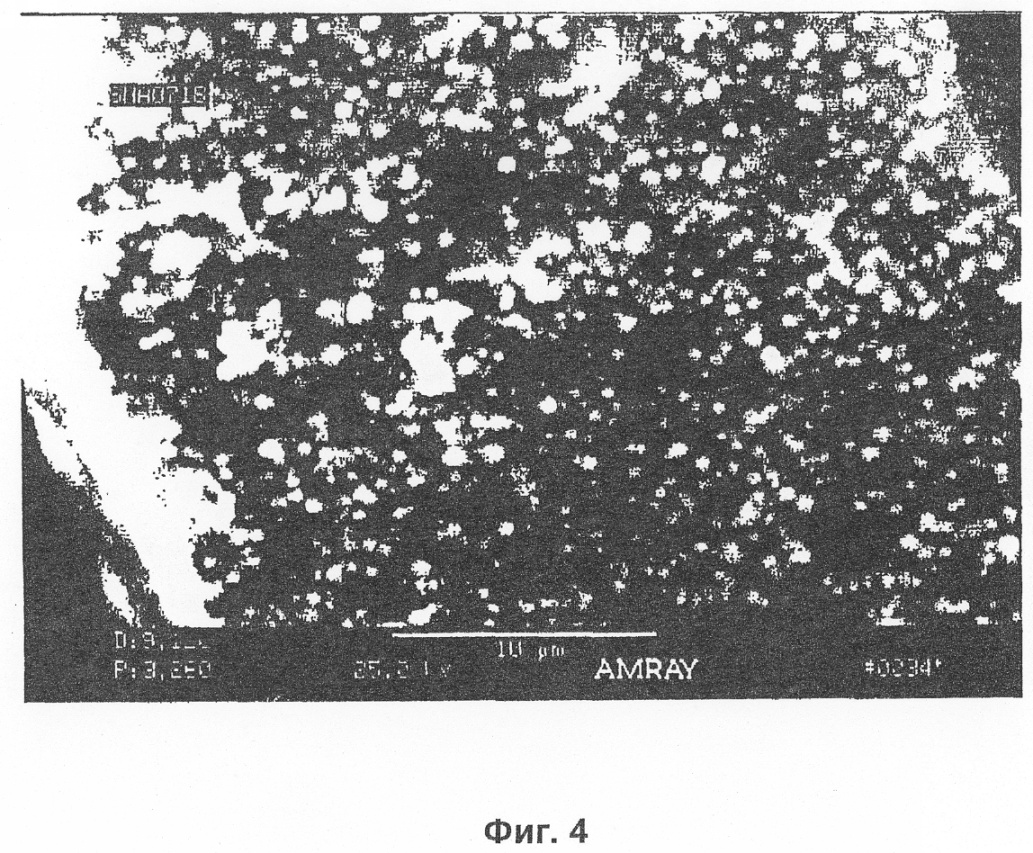 Фиг.4 представляет электронное изображение с обратным рассеянием сканирующей электронной микрофотографии, при увеличении 5000 Х (измеряемом, когда изображение проецируется в трафарете фотобумаги размером 8,5″×11″), внутреннего сечения той же частицы катализатора, которая показана на Фиг.2А.