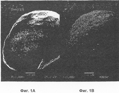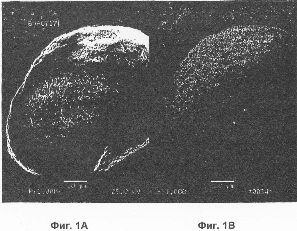 Фиг.1А представляет вторичное электронное изображение сканирующей электронной микрофотографии, при увеличении 1600 Х (измеряемом, когда изображение проецируется в трафарете фотобумаги размером 8,5″×11″), варианта катализатора настоящего изобретения, состоящего из промотированного платиной кобальта, покрывающего оксид алюминия, причем катализатор приготовлен, как описано в Примере 2.