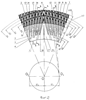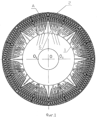 На фиг.1 изображена фронтальная проекция размалывающей гарнитуры дисковой мельницы в сборе. (Ближайшая к центру дисков окружность, изображенная тонкой линией, является кромкой входного отверстия несущего статорного диска). Кольцевая полость, расположенная между входной окружной кромкой отверстия несущего статорного диска и закрепленными на нем и роторном несущем диске секторами является разгонной зоной (стрелками показано направление движения волокнистого полуфабриката).