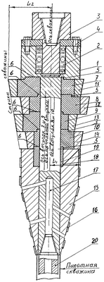 Ример 15, имеющий переднюю коническую часть, переходящую в концевую цилиндрическую часть, армированный породоразрушающими элементами 16, имеет систему промывочных каналов 17 и своей эксцентричной проточкой 18 входит в эксцентриковую втулку 19, которая своим эксцентриковым выступом 6 входит в конгруэнтную ей проточку 5 в эксцентриковой втулке 10, что обеспечивает жесткое соединение римера 15 с валом 1, препятствуя его провороту относительно оси вала 1. В передней части вал 1 имеет резьбу для соединения с буровым снарядом 20. Радиус концевой цилиндрической части римера 15 равен расстоянию L1 от породоуплотняющей кромки переднего конического катка 14 раскатывателя до оси вала 1 по нижнему краю катка и меньше на 15-20% расстояния L2 от породоуплотняющей кромки концевого конического катка 11 до оси вала 1 по верхнему краю катка. Такая разница между величинами L1 и L2 (минимальный радиус начального и максимальный радиус концевого катков) объясняется тем, что при проходке скважин методом раскатки диаметром до 200 мм на каждый каток раскатывателя приходится увеличение радиуса скважины на 6-8%, а при проходке скважин диаметром 300 мм и более на каждый каток приходится увеличение радиуса скважины на 4-5% (в зависимости от количества катков в раскатывателе). В предлагаемом устройстве количество катков должно быть не менее 4, а средняя величина общего увеличения радиуса скважины равна 15-20%.