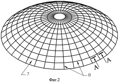 3. Сетчатая оболочка по п.1, отличающаяся тем, что, с целью увеличения жесткости каркаса оболочки и повышения ее несущей способности, звездообразные узлы объединены между собой перекрестными тросовыми растяжками.