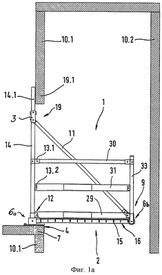 На Фиг.1а схематично изображены рабочие подмости, предназначенные для шахт лифтов или для установки в проемах стен зданий.