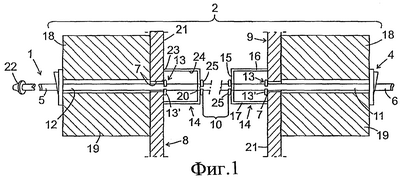 Ограничительные средства 13, 25 расположены в некоторых заранее заданных местах вдоль каждого стержня и предназначены для установки по меньшей мере одного упора-разделителя 14 в заранее заданном положении на стержне. В специальном варианте выполнения, показанном на фиг.1, два упора-разделителя 14 установлены с предотвращением смещения внутрь по стержню благодаря ограничительным средствам 25 (по одному для каждого упора-разделителя), вследствие чего эти упоры-разделители 14 также расположены на заранее заданном расстоянии друг от друга. Однако упоры-разделители 14 выполнены таким образом, что все-таки могут смещаться в наружном направлении от соответствующего ограничительного средства 25. Каждый упор-разделитель 14 имеет также сквозное отверстие 20 для стержня, которое либо выполнено в виде отверстия в центре упора-разделителя 14 и предназначено для надевания упора-разделителя 14 с одной концевой части 11, 12 стержня, либо выполнено в виде продолговатого отверстия, проходящего от края упора-разделителя 14 к его центру и предназначенного для надевания упора-разделителя поперек стержня. В показанном варианте упор-разделитель 14 выполнен в виде элементов, отрезанных от более длинной балки U-образного профиля, выполненной из нержавеющего материала, при этом в центральной части 15 U-профиля упора-разделителя 14 выполнено отверстие, чтобы его можно было надеть на стержень с концов 5, 6 таким образом, чтобы две опоры 16, 17 U-профиля были обращены наружу от центральной части 10 стержня и каждая из них соприкасалась бы своей торцевой поверхностью 23 с внутренней поверхностью 21 ближнего из щитов 8 и 9. На стержне, на том же уровне, на котором находятся свободные торцевые поверхности 23 двух опор 16, 17 упора-разделителя 14, имеется еще одно ограничительное средство 13, которое предотвращает выпадение упора-разделителя во время сборки литейной формы и образует направляющую 13′ разлома для отрезания стержня по завершении формования. Предполагается также, что щиты 8, 9 должны опираться на эти ограничительные средства 13, когда литейная форма собрана. Отверстие 20 может быть пробито в центральной части 15 таким образом, что во время пробивания будет образован конус, выступающий из этой центральной части 15. Указанный конус затрудняет проникновение влаги по стержню.