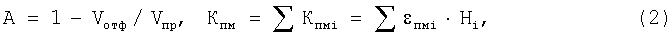 А – эмпирический коэффициент, учитывающий степень аварийной опасности по скважине при образовании провалов в верхней части многолетнемерзлых пород, а также количество и объемы произведенных отсыпок образовавшихся провалов в многолетнемерзлых породах, принимаемый равным 1,0 при отсутствии отсыпок провалов на устье или менее 1,0 согласно расчету (2) при произведенных фактических отсыпках провала в объеме Vотф;