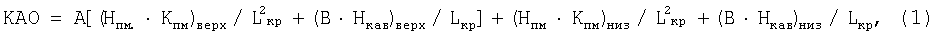 (Нпм·Кпм)верх, (Нпм·Кпм)низ, (Нкав)вер, (Нкав)низ – соответствующие произведения суммарной толщины Нпм в разрезе просадочных многолетнемерзлых пород с m 250 кг/м3 и их суммарной просадочности Кпм в верхней части разреза многолетнемерзлых пород, с индексом “верх”, куда достигает производимая с поверхности отсыпка песком образующихся провалов в оттаивающих кавернозных, просадочных многолетнемерзлых породах вокруг скважины с поверхности, и произведение соответствующих величин Нпм·Кпм в нижней части с индексом “низ”, куда не достигает отсыпка с поверхности, и суммарные толщины Нкав кавернозных, с коэффициентом кавернозности более 1,22 по диаметру, пород с льдистостью m<250 кг/м3 в верхней и нижней частях разреза многолетнемерзлых пород с незаполненными цементом кавернами;