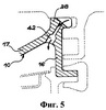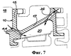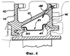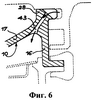 Отверстия 36, как показано на чертежах, имеют постоянное проходное сечения. Однако вместо таких отверстий могут выполняться также и постепенно расширяющиеся отверстия, проходное сечение которых увеличивается по направлению потока к камере 20, либо отверстия 42 со ступенчатым профилем сечения, как показано на фигуре 5, либо даже сопловые отверстия 43, имеющие сопловые части, выполненные внутри них, с изменением диаметра, как показано на фигуре 6. Такие отверстия 42 и 43 могут располагаться аналогично отверстию 36. При этом, подбирая соответствующим образом диаметры на входе и выходе этих отверстий, можно осуществлять калибровку потока вентиляционных газов на входе (выбирая меньшее значение диаметра на входе) и изменять эффективность процесса успокаивания потока при его выходе в камеру 20 (выбирая большее значение диаметра этих отверстий на выходе), благодаря чему обеспечивается более равномерное поступление газов к заслонке 21.