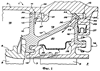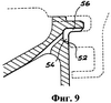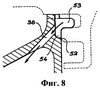 Аналогичными средствами можно соединить камеры 19 и 20. Продольные пазы 33, аналогичные пазам 30 в крюкообразной части 26, выполняются в крюкообразной части 28 крепежной вставки, расположенной сзади. Между оконечностью крюкообразной части 28 крепежной вставки и крюкообразной частью 29 корпуса образуется пространство 34. Подаваемые на обдув газы поступают в пространство 34, направляясь к радиальным пазам 35, выполненным в промежутках между соседними продольными пазами 33. Эти радиальные пазы не сообщаются непосредственно с находящейся ниже по потоку камерой 20, а соединены с ней через отверстия 36, число которых может быть различным в зависимости от количества радиальных пазов 35, на каждый из которых приходится по одному отверстию. Отверстия 36 проходят в направлении камеры 20 насквозь через крепежную вставку 10 в зоне сопряжения ее стенок 16 и 17. При таком расположении этих отверстий обеспечивается получение таких же характеристик и тех же самых преимуществ, как и для рассмотренного выше сочленения 11. Отверстия 36 направлены наклонно под углом, что создает довольно значительную центростремительную составляющую, направляющую поток вентиляционных газов на обдув к кольцу 3. Пазы 33 могут так же, как и в рассмотренном выше случае, выходить в соответствующие канавки 50, которые как бы являются их продолжением в направлении пространства 34. Обдув кольца 3 вентиляционными газами осуществляется с еще большей равномерностью при их пропускании через заслонку 21, прежде чем они выйдут в обход нее через неплотности соединений в конструкции или же через выпускные каналы 51, предусмотренные в кольце 3, и попадут в основной канал 7. Ограничительный упор на оконечности крюкообразной части 29 корпуса располагается позади задней стенки 16 и обеспечивает образование пространств, обозначенных позициями 31 и 34. Кольцо 8, расположенное далее в направлении против потока в основном канале, прижато к передней стенке 15 в зоне расположения сочленения 13. Уплотнительный компенсатор 37, установленный в канавке крюкообразной части 29 и поджимаемый задней стенкой 16, обеспечивает герметичность сочленения 12 по направлению основного потока. В своем поперечном сечении этот уплотнительный компенсатор имеет три лепестка, размещенных в один ряд, и по этой причине он именуется омегообразным стыковым компенсатором. Герметичность соединения уплотнительного компенсатора 37 и крюкообразной части 29, по существу, удваивается за счет контактной плоскости 52 крюкообразной части корпуса, прижимающейся к задней стенке 16 с образованием при этом линии уплотнения. Радиальные пазы 35, отверстия 36, 42 и 43 конструктивно выполняются таким образом, что они не нарушают этой линии уплотнения, обеспечивая при этом требуемое сообщение пространства 34 с камерой уплотнительного компенсатора 37. Варианты осуществления изобретения, представленные на фигурах 8 и 9, позволяют добиться того же результата. Как показано на фигуре 8, радиальные пазы 53 (выполненные вместо пазов 35) удлинены проточкой части 54 задней стенки 16 для того, чтобы обеспечить доступ к отверстиям 36, что сопровождается соответствующим уменьшением ширины контактной плоскости 52, но не полным ее устранением. Как показано на фигуре 9, пазы 56 (выполняемые вместо пазов 35 или 53) проходят только по внутренней поверхности крюкообразной части 28 крепе
