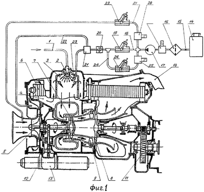 При переходных процессах, например, разгонах ГТД открывается электроклапан 25 и подача топлива по второй ветви 24 дополнительно увеличивает расход дополнительного топлива через дополнительную форсунку 23, в результате чего сокращается длительность неустановившихся режимов работы. Предварительно подогретое топливо, поданное по третьей ветви 27 через воздушный компрессор 5, усиливает эффект управления скоростью сгорания всей массы подаваемого в ГТД топлива и тем самым повышается эффективность рабочего процесса двигателя.