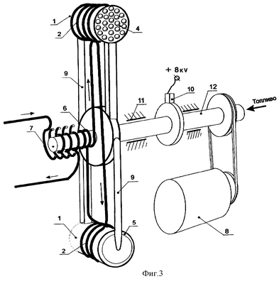 На фиг.3 приведена механическая компоновка основных агрегатов плазменного автодвигателя: 1 – корпусы ионных источников, 2 – индукторы, 4 – катодная сетка, 5 – воздушный зазор подачи воздуха, 6 – обмотка выходного трансформатора, закрепленная на роторе (L3), 7 – неподвижная обмотка выходного трансформатора (L4), 8 – генератор тока 400 Гц, 9 – трубки поступления топлива на плазмоид, 10 – электрощеточное устройство передачи разгонного напряжения, 11 – подшипники, 12 – трубчатый вал с устройством подачи топлива.