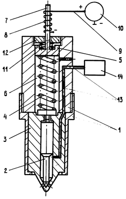 Система для подачи топлива в дизель содержит форсунку 1 с запорным органом 2, установленным в распылителе 3, пружину 4, предназначенную для нагружения запорного органа 2, поршень 5, расположенный в камере 6. Поршень 5 выполнен за одно целое со штоком 7. Вокруг штока 7 размещена электрическая обмотка 8. Шток 7 и электрическая обмотка 8 образуют соленоид. Один конец электрической обмотки 8 соединен электрической цепью 9 с положительным полюсом генератора, а другой – с отрицательным. Над поршнем 5 размещены дополнительная пружина 11 и регулируемый упор 12. При изменении положения регулируемого упора 12, то есть при ввертывании или вывертывании его по резьбе, выполненной в верхней части камеры 6 форсунки 1, изменяется и предварительная затяжка пружин 4 и 11, обусловливающая создание необходимого давления начала впрыскивания топлива в цилиндр дизеля.