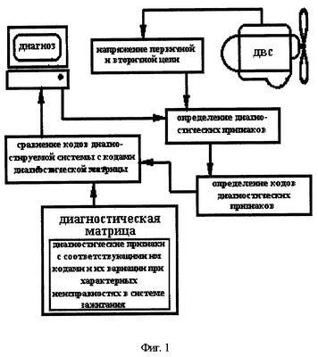 Суть способа заключается в анализе участков локальных диагнозов на характеристиках первичного и вторичного напряжений в цепях системы зажигания, выделении группы диагностических признаков и сравнении с нормативными значениями, с последующими кодированием и постановкой диагноза в автоматическом режиме на основе диагностической матрицы (фиг.1, фиг.2). Поэтапно это можно представить так: на работающем двигателе при помощи датчика высокого напряжения 4, зажима 5, импульсным датчиком 6 срабатывания первого цилиндра 14 производят съем диагностических сигналов в соответствующих цепях контактно-батарейной системы зажигания. Полученный многоинформационный сигнал преобразуют в цифровой код при помощи аналого-цифрового преобразователя (АЦП) 2, который поступает в персональный компьютер 1, где записывается на жестком носителе. В персональном компьютере записанный диагностический сигнал обрабатывают математическим аппаратом и на заданных участках локальных диагнозов определяют численные значения выделенной группы диагностических признаков. Значения диагностических признаков сравнивают с их нормативными допустимыми значениями. По результатам сравнения каждому диагностическому признаку присваивают диагностический код по принципу: «0»-норма, «-1»-ниже нормы, «+1»-выше нормы. Образованное множество диагностических кодов сравнивают с их набором в диагностической матрице и по результатам сравнения дают заключение о техническом состоянии системы. Процесс повторяют с вариацией режимов проверки системы зажигания (работа на минимальных оборотах холостого хода, повышенных – 0,8 от номинальных, а также переходные режимы).