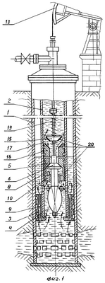 Затем привод 13 обеспечивает обратное движение тягового органа 12 вверх, при этом клапан 6 поднимается до посадки в седло 7, а клапан-отсекатель 15 отходит от седла 17 дополнительного пакера 16. Таким образом, плунжер 5 с закрытым клапаном 6 поднимает пластовую жидкость, находящуюся в надплунжерном пространстве через открывшийся клапан-отсекатель 15 и кольцевой канал между седлом 17 дополнительного пакера 16 и тяговым органом 12 на поверхность.