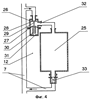 В клапане 26 имеется тарелка 28, которая может перекрывать вход в клапан 26 благодаря тому, что на нее через шток 29 действует пружина 30. Клапан 26 выполнен так, что он разделен на две полости герметичным образом. В первой полости клапана 26 находится упомянутая тарелка 28 и за ней имеется патрубок 32, соединяющий клапан 26 с резервуаром 25. Вторая полость клапана 26 как минимум одним отверстием 31 соединена с полостью кожуха 12.