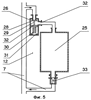 Разделение на две полости может быть осуществлено в двух исполнениях: эластичной мембраной 27 (фиг.4) или поршнем 32 (фиг.5).