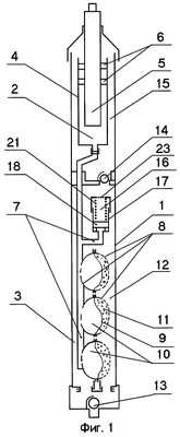 Головная часть 3 содержит как минимум один бачок 8, разделенный эластичной диафрагмой 9 на полости переменного объема: полость 10 для приводной жидкости и полость 11 для откачиваемой жидкости. Бачок 8 выполнен с возможностью фиксации крайних положений диафрагмы 9, т.к. диафрагма 9 установлена с возможностью изменения ее формы и положения при изменении давления в полости 10 для приводной жидкости и с возможностью принятия диафрагмой 9 формы внутренней стенки бачка 8, т.е. бачок 8 определяет форму и объем полостей 10 и 11 при крайних положениях диафрагмы 9. Бачок 8 выполнен так, что обеспечивается соединение полости 10 с каналом 7 приводной жидкости, а полости 11 – с полостью 12 кожуха благодаря наличию отверстий в соответствующих стенках бачка 8. В полости 12 кожуха имеются всасывающий клапан 13, через который полость 12 соединена с источником откачиваемой жидкости, и нагнетательный клапан 14, через который полость 12 соединена с каналом 15 отвода откачиваемой жидкости. Оба клапана 13 и 14 являются обратными клапанами (выполнены с возможностью предотвращения обратного тока жидкости).