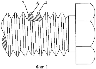 Для получения стопорной зоны достаточно стандартный винт обкатать между гладкими роликами, при этом вершины резьбы деформируются, образуя на боковой поверхности профиля резьбы стопорные элементы 2 в виде выступов высотой а (фиг.4), что не требует разработки и применения специального инструмента и тем самым снижает трудоемкость изготовления.
