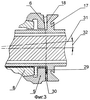 Направление 29 движение смазки, стекающей из смазочной части опорного слоя и попадающей в смазочный слой упорной части подшипника, приведено на фиг.3. Там же приведена схема сопряжения рабочей усеченной конической поверхности 6 упорной обоймы 5 с плоской поверхностью 18 гребня 17. При этом ось 31 рабочей усеченной конической поверхности 6 расположена под углом 32 к оси вала 15.