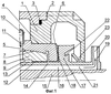 Кроме того, смазочный слой упорной части подшипника может быть образован между указанной плоской рабочей поверхностью 18 гребня 17 и двумя или более неподвижными поверхностями частей усеченных конусов, оси которых расположены под углом к оси вращения и имеющих образующие, параллельные плоской поверхности. Это приводит к увеличению количества смазочных слоев, что является целесообразным при больших размерах упорной части подшипника.