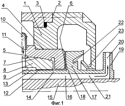 Предпочтительно располагать движущиеся поверхности опорно-упорного подшипника на наружной поверхности втулки 14 с осуществлением отвода тепла путем создания движения воздуха в каналах 21 между ее внутренней поверхностью и валом 15, на который насажена указанная втулка. Движение воздуха может быть обусловлено действием центробежных сил в воздушном потоке, который возникает в каналах 20 фланца втулки, перпендикулярных оси вала 15.