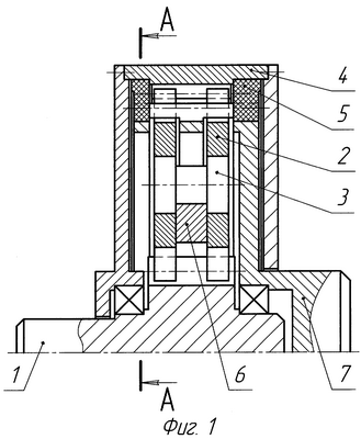 Суть технического решения поясняется чертежами, где на фиг.1 изображен общий вид передачи в разрезе, на фиг.2 – разрез по А-А на фиг.1.