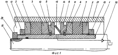 При перемещении штока 16 влево давление в полости 19 возрастает до рабочего. Под действием создавшегося перепада давления кольцо 2 перемещается вправо, сжимая тарельчатую пружину 15 и повышая давление в камере 14. При этом давление в камере 14 приблизительно равно половине рабочего давления. Таким образом, уплотнительные элементы 6 и 7 испытывают перепад давления, составляющий примерно 1/2 часть рабочего давления. Контактное давление в парах трения также составляет половину рабочего давления.