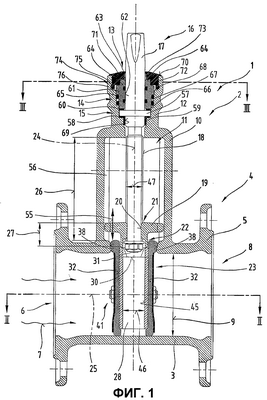 Далее, для осевой фиксации носителя 61 уплотнения предпочтительно предусмотрена надставка 17 шпинделя, заключенная в кольцевой выемке 71 горлового удлинения 12 корпуса, и предусмотрен носитель 61 уплотнения с опорными поверхностями 72, заключенный в кольцо 73 горловины, которое фиксируется, например, при помощи фиксирующего устройства 74, образованного подпружиненными выполненными в форме каблука кронштейнами 75 в фиксирующих выемках 76 в горловом удлинении 12 корпуса.