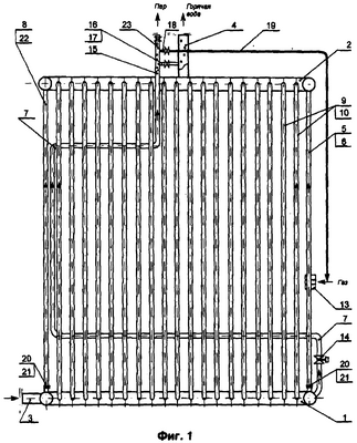 Основой топки шахтного типа пароводогрейного котла являются нижний входной 1 и верхний выходной 2 коллекторы, выполненные из труб диаметром около 200 мм. Коллекторы расположены горизонтально. К коллектору 1 присоединен входной патрубок 3, к коллектору 2 присоединен выходной патрубок 4 подачи потребителя горячей воды. Коллекторы 1 и 2 соединены между собой трубами экранов диаметром около 50 мм. Посредством труб 5 выполнен фронтальный 6 экран. Посредством труб 8 выполнен задний 22 экран. Посредством С-образных труб 9 выполнены боковые 10, подовые 11 и потолочный 12 экраны. Между трубами 5 фронтального экрана 6 установлено горелочное устройство 13. В центральной части топки имеется двухсветный змеевиковый трубный парообразователь 7, входной патрубок которого соединен трубопроводом с нижним входным коллектором 1 вне зоны топочного пространства, что вызвано необходимостью врезки в него встроенного регулятора 14 питания парообразователя 7 водой. Выходной патрубок 15 парообразователя 7 соединен с выходным патрубком 4 верхнего коллектора 2. Выходной патрубок 15 парообразователя 7 выполнен на выходе в виде гребенки 15, первый патрубок 16 которой присоединен трубопроводом 17 к выходному патрубку 4 котла, по которому потребителю поставляется горячая вода. К второму патрубку 18 гребенки 15 на выходе двухсветного змеевикового трубного парообразователя 7 присоединен трубопровод 19 подачи пара в горелку 13 для улучшения свечения пламени. На входе гребенки 15 имеется также патрубок 23 подачи пара потребителю. Двухсветный змеевиковый трубный парообразователь 7 на входе имеет регулятор питания 14 водой. Трубы фронтального 6 и заднего 22 экранов имеют гидравлические шайбы 20 для обеспечения равномерного расхода воды по всем экранам котла.