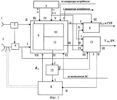 Если в радиолокационной головке самонаведения (РГС) используется непрерывный СПЦ, то подается команда ЦУ по скорости сближения Vцу (доплеровской частоте), в соответствии с которой будут селектироваться радиосигналы только той цели, скорость сближения с которой соответствует скорости целеуказания. Если в РГС используется импульсный СПЦ, то в модуль 5 обработки поступает команда ЦУ по дальности, в соответствии с которой приемник отраженного сигнала будет отпираться только на время прихода сигналов, отраженных от цели, отстоящей от истребителя на нужную дальность Дцу. При квазинепрерывном СПЦ подаются команды ЦУ и по дальности, и по скорости. Кроме того, команды ЦУ по дальности, скорости сближения и угловым скоростям линии визирования поступают в качестве начальных условий в вычислители, экстраполирующие параметры относительного движения ракеты и цели в автономном режиме работы ИВС, предшествующем захвату цели на траектории, и в случае воздействия на нее радиопомех. Готовность ИВС к работе контролируется по специальным сигналом контроля, поступающим в аппаратуру истребителя по цепям обратной связи (фиг.1).