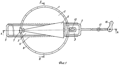 На фиг.1 изображен предлагаемый планиметр, вид сверху; на фиг.2 дан разрез по А-А на фиг.1; на фиг.3 представлен разрез по Б-Б на фиг.1; на фиг.4 показана площадь измерения со схемой конуса.