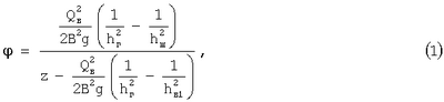 где Qв – расход воды, м3/с; hг – высота потока воды в выходной части лотка при взаимодействии с гладкой поверхностью, м; hш – высота потока воды в выходной части лотка при взаимодействии с шероховатой поверхностью трения, м; hв1 – высота потока воды во входной части лотка, м; В – ширина лотка, м; g – ускорение свободного падения, м/с2; z – вертикальная координата между центрами тяжести потока в сечениях потока во входной и выходной частях лотка, м.