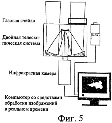 На фиг.5 показана форма выполнения оборудования для определения местоположения точечного источника с использованием корреляционного газового фильтра и двойной телескопической оптической системы. Вытекание газа из установок предприятия контролируется двойной телескопической оптической системой, в которой в один из оптических каналов включена газовая корреляционная ячейка и в которой два изображения помещаются рядом друг с другом в плоскости изображения чувствительной инфракрасной камеры.