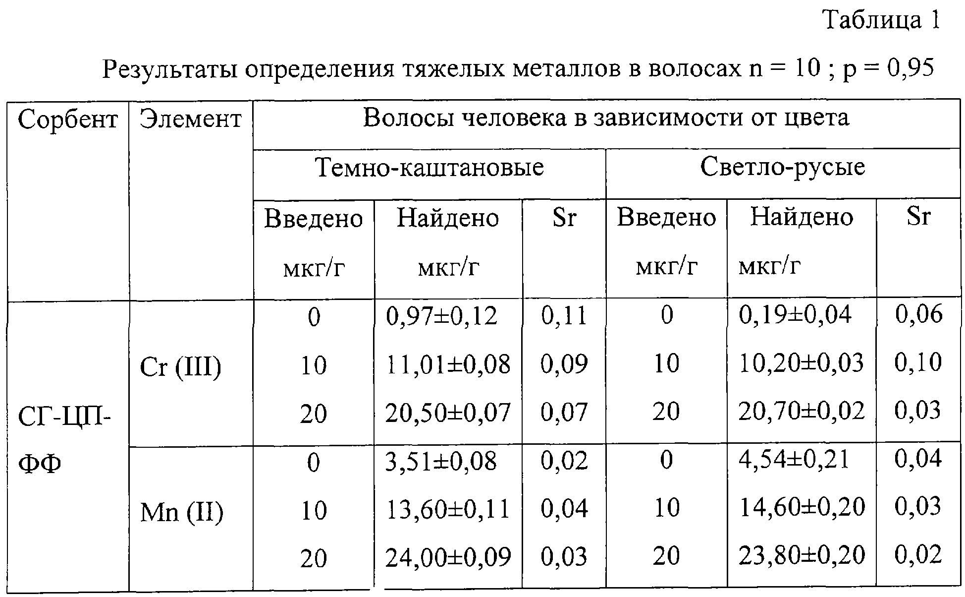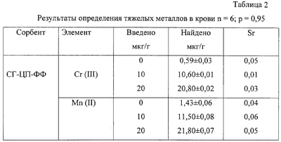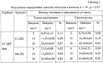 Изобретение относится к области аналитической химии и биомедицины, может быть использовано в экологии для тестирования и определения ионов Cr (III), Mn (II). Известны способы определения некоторых металлов в крови и волосах человека [1-2]. Сущность метода в атомно-абсорбционном определении некоторых макро- и микроэлементов после предварительной пробоподготовки. При этом содержания элементарного состава зависят от климатических, геохимических и экономических условий места проживания. Известен способ сорбционного концентрирования и атомно-абсорбционного определения кобальта, никеля и кадмия в биосубстратах на сорбенте полистирол-2окси-азо-2’окси-3’нитробензол-5′-сульфокислота. [3] Известен также способ физической сорбции 4-(2-тиазолилазо)-резорцина, иммобилизованный на поверхности силохрома С-120 (СГ-ТАР), который используется для определения ионов тяжелых металлов в руде, катализаторе с сорбционным концентрированием и определением методом спектроскопии диффузионного отражения [4]. Все вышеуказанные способы не позволяют определять ионы Cr (III), Mn (II) из-за низкой чувствительности и малой избирательности, а также недостаточной изученности по отношению к указанным элементам. Задача предлагаемого изобретения – расширение ряда сорбентов путем модификации и использование новых фаз в анализе биообъектов. Технический результат – в создании эффективных твердых фаз для концентрирования и количественного определения микроэлементного состава биосубстратов и гетерогенных катализаторов нового типа. Указанный технический результат достигается тем, что получают модифицированный сорбент (МС) путем иммобилизации избирательного органического реагента – фенилфлуорона (ФФ) на Cr (III) и Mn (II) при разной кислотности на твердый носитель. При этом иммобилизованный реагент начинает работать как сорбент для концентрирования микроэлементов и реагент для их тестирования и количественного определения. Сущность предлагаемого изобретения в том, что в качестве избирательного органического реагента используют фенилфлуорон (ФФ), растворенный в водно-этанольной среде в соотношении 1:1, иммобилизованный за счет физической сорбции на гидрофобный носитель – силикагель марки КСК №2, 5, предварительно очищенный и обработанный хлоридом цетилпиридиния (ЦП) и, используя различия в значениях рН 4-5 (Cr), 7-8 (Mn), измеряют величину диффузного отражения при длинах волн 530 и 590 нм соответственно для Cr (III) и Mn (II). Конкретный пример выполнения Навеску силикагеля (СГ) в конической колбе обрабатывают 1 М раствором Н2SO4 (1 г СГ 2 мл раствора H2SO4), затем промывают дистиллированной водой до слабокислой реакции. Навески по 0,5 г воздушно-сухого СГ в конических колбах смешивают с деципроцентным раствором ЦП, а затем после перемешивания в течение 30 мин вводят 0,03% водно-этанольного раствора ФФ и создают оптимальные условия кислотности (рН – 4,0-6,0). Готовят стандартные растворы ионов Cr (III) и Mn (II) с концентрацией 0,1 мг/мл. Для построения градуировочного графика аликвоты стандартных растворов элементов пропускали через весь ход анализа, включая сорбцию на СГ-ЦП-ФФ (силикагель-цитилпиридиния-фенилфлуорон). В колбы с притертыми пробками вводят по 0,1 г МС, туда же вводят увеличивающиеся количества стандартных растворов хрома и марганца, создают оптимальную для сорбции кислотность (рН 4-5 дл