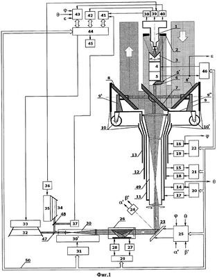 На фиг.1 представлена структурная схема многофункциональной оптико-локационной системы, где 1 – комбинированное фотоприемное устройство, 2 – зеркально-линзовый объектив приемного телескопа, 3 – встроенное в приемный телескоп уголковое зеркало компенсатора поворота изображения, 4 – привод уголкового зеркала компенсатора поворота изображения, 5 – датчик углового положения уголкового зеркала компенсатора поворота изображения, 6 – призма-ромб, 6 – круглая диафрагма, установленная на выходной грани призмы-ромба 6, 7 – первое зеркало, 8 – второе зеркало, 8 – третье зеркало, 9 – горизонтальная платформа, 9 – стойка, на которой закреплен центр второго зеркала, установленная на горизонтальной платформе 9, 9 – стойка, на которой закреплен центр третьего зеркала, установленная на горизонтальной платформе 9, 10 – система шкивов, посредством которой второе зеркало связано со вторым валом вращения, 10 – система шкивов, посредством которой третье зеркало связано со вторым валом вращения, 11 – первый вал вращения, 12 – промежуточный вал вращения, 13 – второй вал вращения, 14 – датчик углового положения первого вала вращения, 15 – датчик углового положения промежуточного вала вращения, 16 – датчик углового положения второго вала вращения, 17 – привод первого вала вращения, 18 – привод промежуточного вала вращения, 19 – привод второго вала вращения, 20 – блок управления вращением первого вала вращения, 21 – блок управления вращением промежуточного вала вращения, 22 – блок управления вращением второго вала вращения, 23 – отражательное зеркало, отклоняющее пучок лазерного излучения, 24 – двухкоординатный датчик положения отражательного зеркала, отклоняющего пучок лазерного излучения, 25 – блок управления устройством (отражательным зеркалом), отклоняющим пучок лазерного излучения, 26 – призма Дове, 27 – датчик углового положения призмы Дове, 28 – привод вращения призмы Дове, 29 – блок управления вращением призмы Дове, 30 – формирующий телескоп, 30 – блок сменных формирующих телескопов, 31 – устройство переключения сменных формирующих телескопов, 32 – зондирующий частотно-импульсный лазер, 33 – блок накачки зондирующего лазера, 34 – пилотный лазер, 35 – блок накачки пилотного лазера, 36 – генератор-синхронизатор, 37 – опорно-контрольный фотоприемник, 38 – аналого-цифровой преобразователь сигналов, 39 – датчик отклонения оптической оси контрольного пучка лазерного излучения, 40 – теплопеленгатор, 41 – блок обработки сигналов и выдачи данных по местоположению объектов, 42 – блок вычисления направления оптической оси передающего канала, 43 – блок формирования изображения контролируемой зоны, выделения и сопровождения объектов, 44 – центральный блок управления, 45 – устройство отображения текущей информации, 46 – блок управления вращением уголкового зеркала компенсатора поворота изображения, 47 – первый светоделитель, 48 – второй светоделитель, 49 – выходной телескоп, 50 – командно-информационная шина. На фиг.1 полутонами выделены в порядке уменьшения яркости сечения контрольного пучка лазерного излучения, зондирующего пучка лазерного излучения, распространяющегося в передающем канале и пучка теплового излучения, распространяющегося в приемном канале (сечение зондирующего пучка лазерного излучения, отраженного от объектов, распространяющегося в приемно