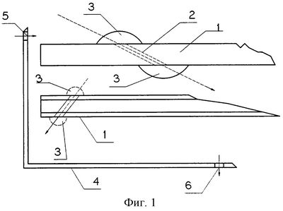 Фиг.1 Схематическое изображение маркерного детектора для регистрации заряженных частиц: 1 – сечение ТК в области трека заряженной частицы, конвертор (а) погружен в атмосферу температурно-чувствительного регистрирующего газа; сечение ТК в области трека заряженной частицы для случая, когда поверхность конвертора (б) покрыта температурно-чувствительным слоем регистрирующего вещества, 2 – условное изображение трека заряженной частицы, 3 – маркирующий материал, осаждаемый вблизи начала и конца трека заряженной частицы, 4 – защитная стенка герметичной камеры с рабочим газом и термоизоляцией или герметичной камеры с нейтральным газом (или вакуумной камеры), 5 – входное отверстие для подачи рабочего газа с заданной температурой, 6 – выходное отверстие для рабочего газа.