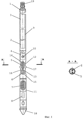 составной корпус 1, датчик 2 ЛМ, датчик 3 ГК, датчик 4 Р, датчик 5 Т, датчик 6 W и датчик 7 СТИ и датчик 8 РИ, причем составной корпус 1 содержит герметичную часть 9, в которой последовательно сверху вниз размещены датчики 3, 2 и 4, а чувствительная мембрана датчика 4 соединена с окружающей средой гидропроводным каналом 10, и негерметичную часть 11 составного корпуса 1, где в герметичных полостях установлены датчики 5, 6, 7 и 8, причем датчики 5 и 6 расположены в одном месте и смещены относительно продольной оси прибора на равные расстояния, здесь же расположены две взаимноперпендикулярные пары, разных по ширине, окон 12 и 13, 14 и 15, снабженные поперечными перемычками 16 и 17, которые с одной стороны предохраняют корпус 1 прибора от воздействия изгибающих моментов сил, возникающих при прохождении прибора в местах искривления скважины, а с другой стороны предотвращают от влияния эффекта шунтирования корпуса и колонны труб в скважине на датчик 6, установленный в данном окне; амортизирующий наконечник 18 и приборную головку 19 под кабельный наконечник.