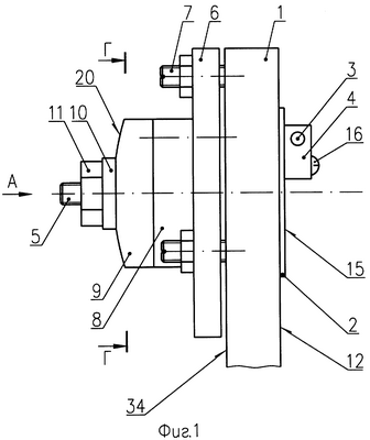 Отжимной фланец 6 взаимодействует с неподвижным основанием 1 посредством фиксирующих элементов 7. Фиксирующие элементы 7 установлены с возможностью поворота в отверстиях 32 отжимного фланца 6.