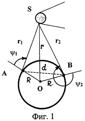 Геометрическая схема расположения наземных пунктов А и В и ИСЗ-ретранслятора S изображена на фиг.1, где введены следующие обозначения: О – центр масс Земли; d – база интерферометра; r – радиус-вектор ИСЗ-ретранслятора.