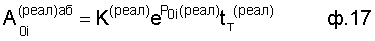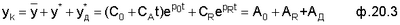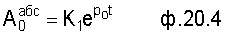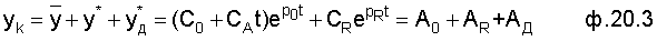 б) нахождение независимого коэффициента усиления К для каждого исследуемого слагаемого Аoi свободной составляющей (А01+А02+…) позволяет найти изменение “абсолютного” (независимого от других слагаемых) в каждый момент времени для данной реальной системы, таким образом “абсолютное” свободное состояние определяется по найденным слагаемым Аoi (относительным) и коэффициентам “относительного” свободного состояния Сoi с учетом дифференциальной формы уравнения всей системы CAP и текущего момента времени tт. Для этого каждое исследуемое слагаемое (свободной составляющей) Аoi переносится в правую часть дифуравнения поэтапно, а слагаемые вынужденного состояния ARi (задаваемые) и не исследуемые на данном этапе слагаемые свободного состояния переносятся в левую. Формируется система с “новыми” внутренними постоянными запаздывания … .