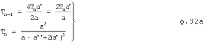 – по найденным математическим выражения для а, а’,… определяются Т1…Тn по формуле 32; математические выражения для Т1… найдены из системы уравнений, полученных приравниванием коэффициентов аналогично примеру, приведенному в формулах 5, 6, 7.